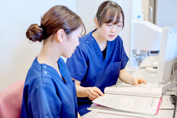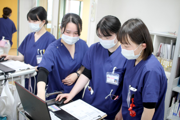 看護教育では、プリセプターや先輩看護師が丁寧に指導する「現場教育」、習熟度に合わせた「集合教育」、そして「自己学習」の3つの組み合せで、着実にステップアップできるよう支援していきます。また、ワークライフバランスの向上に積極的に取り組み、働くことを支える制度も整えています。長く働ける充実した環境で、共に成長できる「仲間」をお待ちしています。