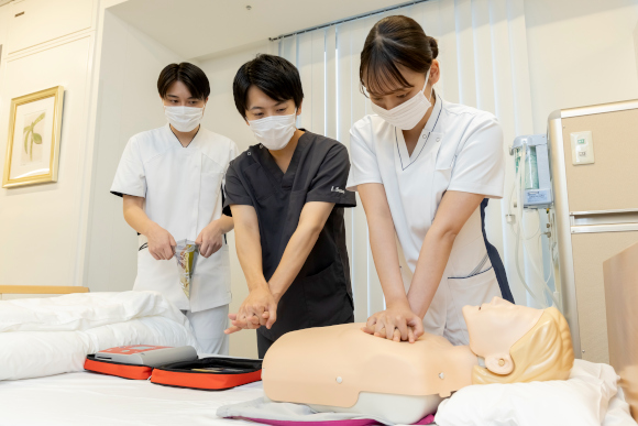 看護部では、質の高い看護と人間味あふれる温かな看護ケアを心掛けています。「Amity Nurse」の育成のため、新卒看護師を全看護職員でサポートし、共に成長する体制を整えています。職員一人ひとりを大切に、笑顔でいきいきと働きつづけられる職場づくりに取り組んでいます。