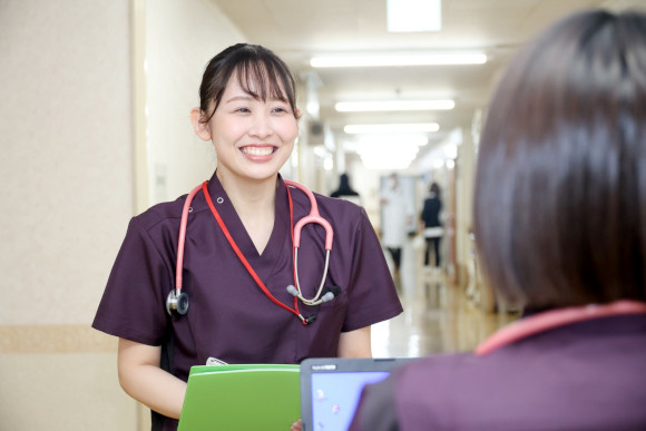 看護部では、知識や技術を学ぶ機会が充実し、新人看護師のそれぞれの成長に合わせたプログラムで安心して学べる環境です。明るい笑顔と元気な挨拶が飛び交う職場で、他職種が協力し合って仕事をしています。“みらい”につながる看護を一緒に創りましょう!