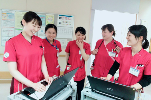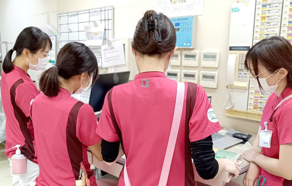 看護部では、理念に基づき地域に密着した高度医療をチームワークで実践。栄養相談や退院調整、薬剤相談など、他職種と密に連携しながら患者さまを中心にサポートしています。さらに、当院ではNP(ナースプラクティショナー)チームが活躍しており、医師・看護師・NPが協力するチーム医療の中で、実践的に学ぶことができます。新人看護師でも、先輩と一緒に協力しながら業務に取り組めるので安心です♪