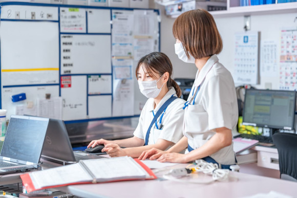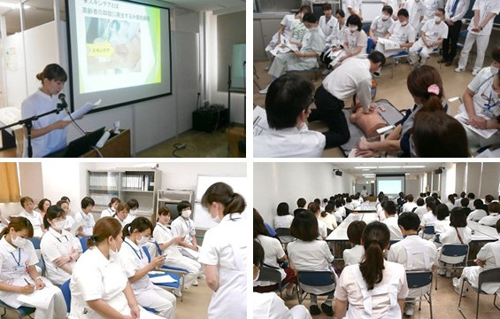 看護部では「気づき」「やさしさ」「思いやり」を看護の場で発揮しながら、患者さまに安心・安全な看護を提供していくことを目指して、スタッフ一丸となって取り組んでいます。新人看護師の名札には目印としてひまわりシールを貼っており、プリセプターだけでなくスタッフみんなで支え、成長できるよう応援しています!新人看護師にとって居心地の良い場所となるように、看護部全体で信頼し合えるチームづくりに取り組んでいます。
