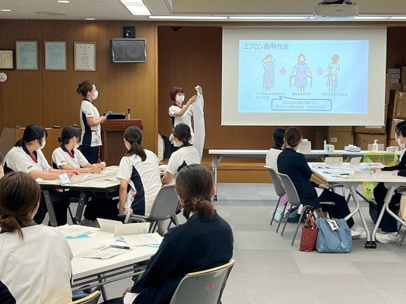 看護局では「患者のニーズに合った質の高い看護を提供する」という理念のもと、看護師としての誇りと責任を持ち、日々の看護に取り組んでいます。働きやすい職場の実践として、バイタルサイン連携システムや血糖測定・インスリン連携システムを導入し、看護業務の効率化を図っています。新人看護師には1年間、先輩看護師がマンツーマンで指導を行い、着実に成長できる教育体制も整っています。看護師としての第一歩を当院で踏み出してみませんか?