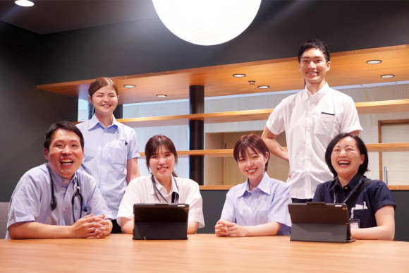 おうちにかえろう。病院は2021年に開院し、120床もの地域包括ケア病棟を有している病院です。患者さま一人ひとりの歴史が入院によって途切れてしまわないように、「さあ、おうちにかえろう。」そんな気持ちになっていただけることを使命としています。看護部やリハビリ部など職種ごとの組織ではなく、病棟ごとに多職種が混在した組織体制を採用しています。退院後の“おうち”での生活を見据えて、職種を横断したチームが一丸となって患者さまを支えています。