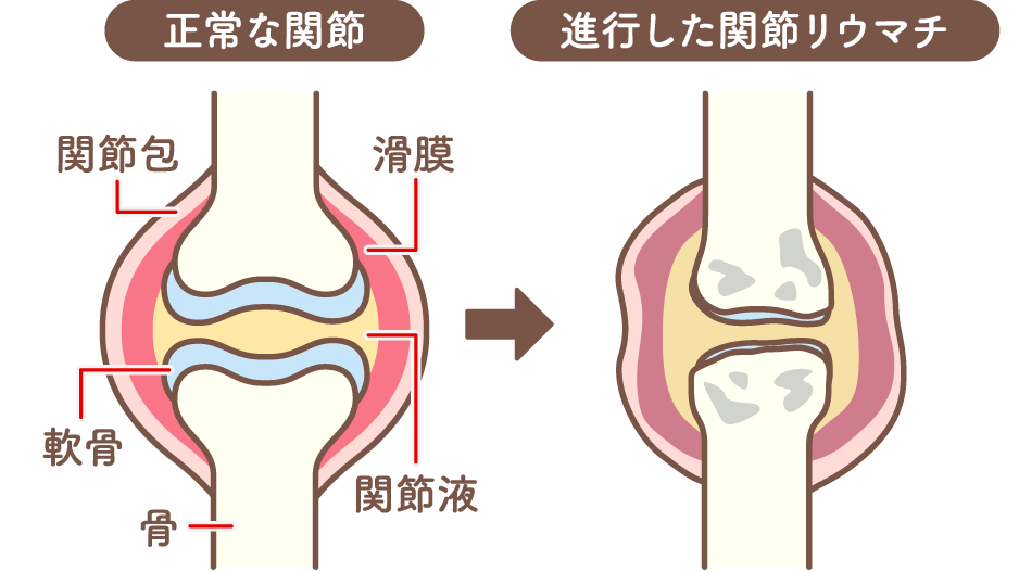 本来、免疫は体内に侵入した異物を排除する働きをしますが、関節リウマチでは免疫の異常により、自身の関節組織(滑膜)を攻撃してしまいます。これにより滑膜が増殖し、関節軟骨や骨が破壊され、変形や機能障害を引き起こします。