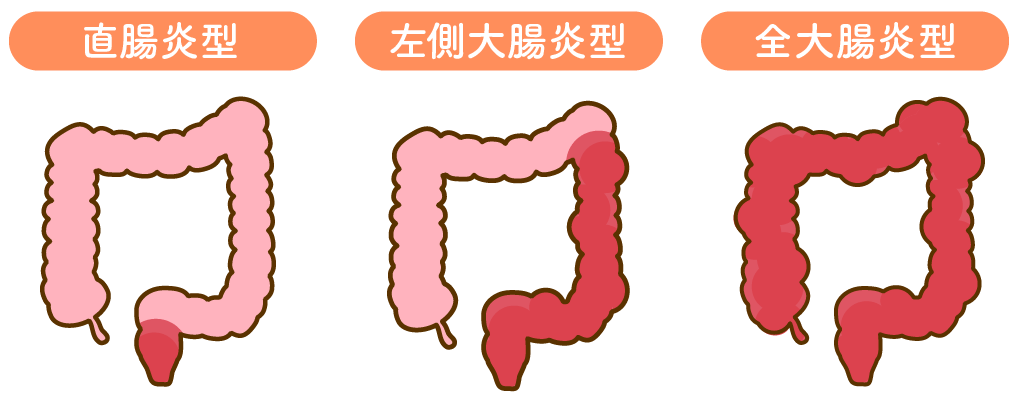 病変範囲は直腸のみの「直腸炎型」、左側結腸までの「左側大腸炎型」、大腸全体に及ぶ「全大腸炎型」などに分類され、炎症が広いほど下痢・血便などの症状や全身状態への影響が強くなり、長期的な大腸がん発症リスクも高くなります。