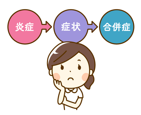 大腸粘膜で免疫反応が過剰に働くことで炎症が持続し、びらん・潰瘍が形成されます。粘膜から出血することで血性下痢や貧血が生じ、炎症と腸管運動亢進によって腹痛・頻回の排便が起こります。